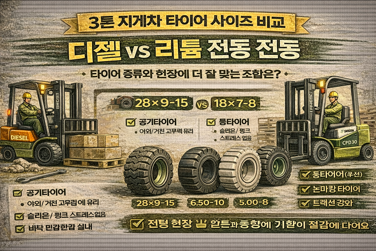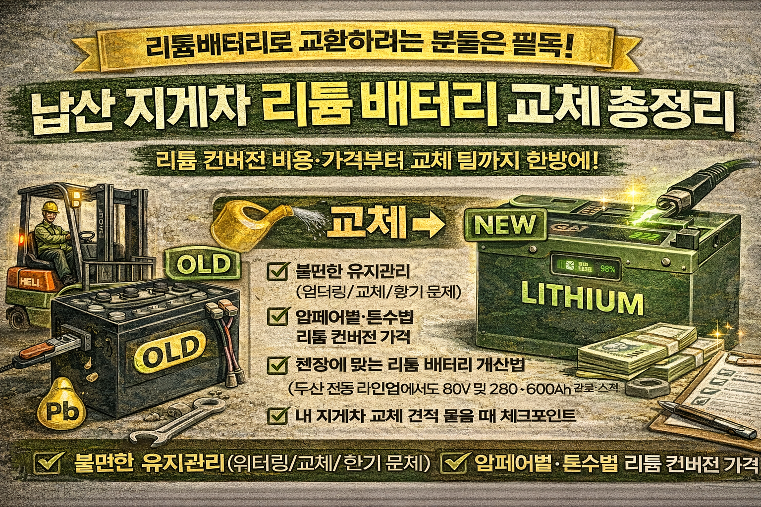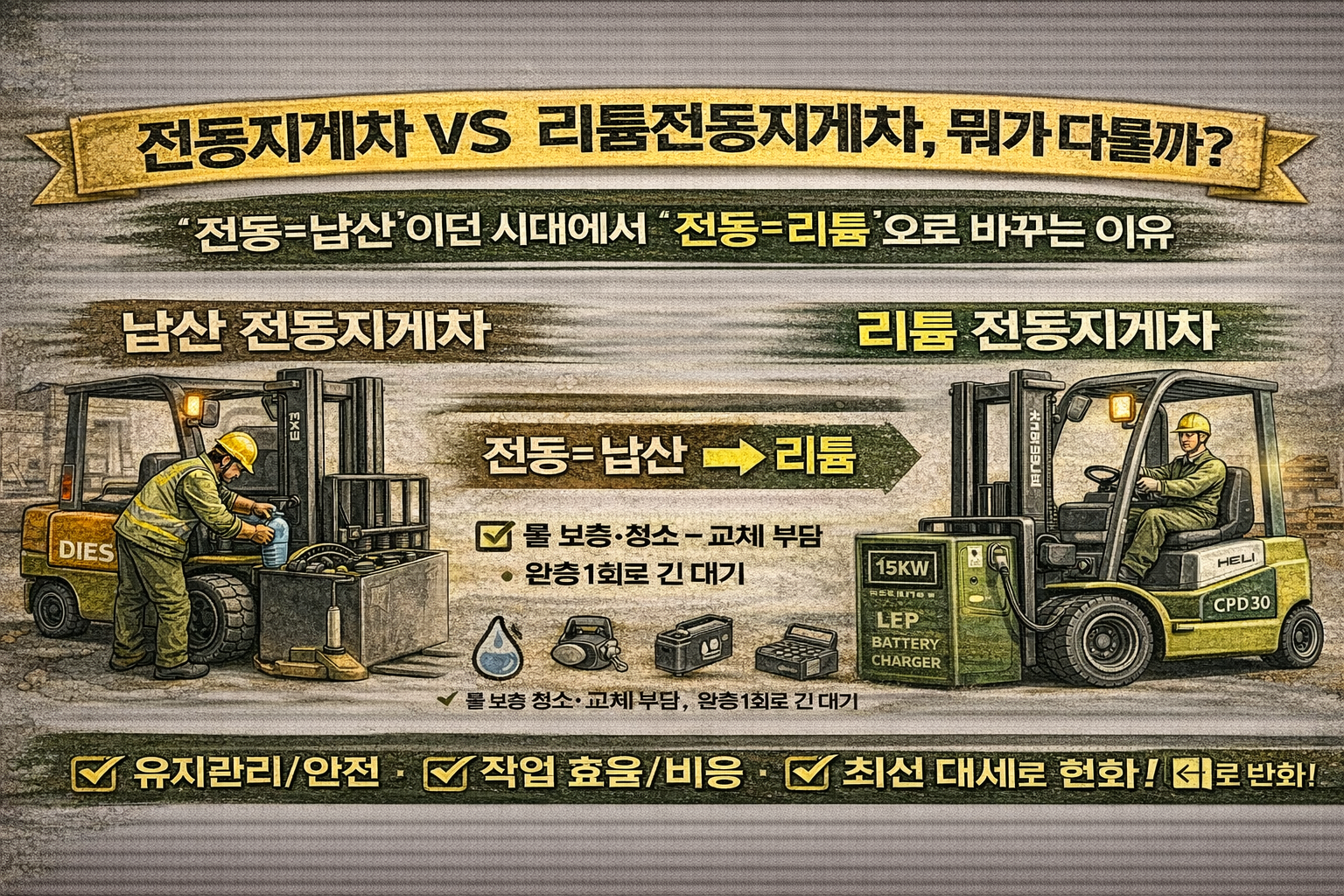 1) 먼저 용어 정리: Ah 말고 “kWh”로 보면 쉬워요 배터리 표기에는 보통 **전압(V) + 용량(Ah)**가 같이 나옵니다. ✅ 핵심: kWh가 ‘연료탱크 용량’ 같은 개념이라, 하루 운영시간 계산이 훨씬 쉽습니다. 2) 하루 운영시간을 용량으로 바꾸는 공식 (현장 버전) 전동지게차가 시간당 얼마나 에너지(kWh)를 쓰는지만 알면 끝입니다. 추천 계산식 필요 배터리(kWh) = (시간당 소비전력 kWh/h) × (하루 가동시간 … 더 읽기