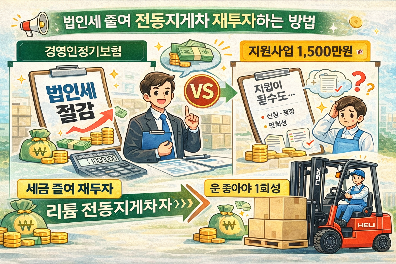 기업부설연구소 말고도, “경영인정기보험”으로 법인세 줄여 전동지게차 재투자하는 방법 전동지게차(특히 리튬 전동)는 유지비 절감 + 가동률 상승 + 작업환경 개선으로 매력적이지만, 현실은 늘 같죠. 그래서 오늘은 “지원사업”처럼 될지 안 될지 모르는 일회성 자금이 아니라, 내 회사 구조 안에서 ‘확률 높게’ 현금흐름을 만드는 방법을 소개합니다. 바로 경영인정기보험입니다. 1) 경영인정기보험이 뭔가요? (핵심만) 경영인정기보험은 말 그대로 대표(또는 핵심 임원)에게 … 더 읽기